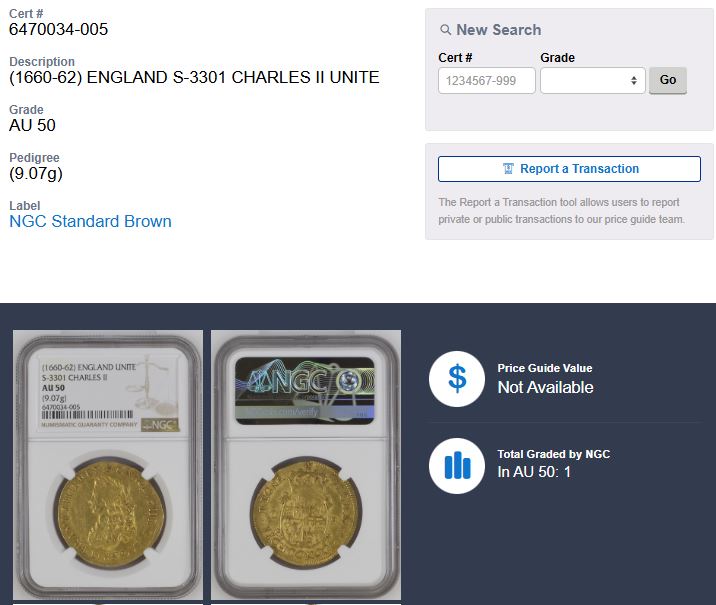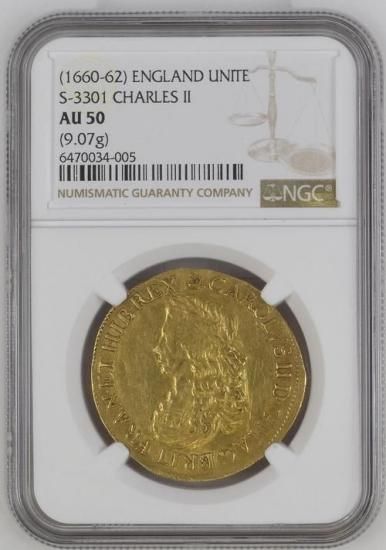イギリス 1660-62 チャールズ2世 ユナイト金貨 NGC AU50 のご紹介です。